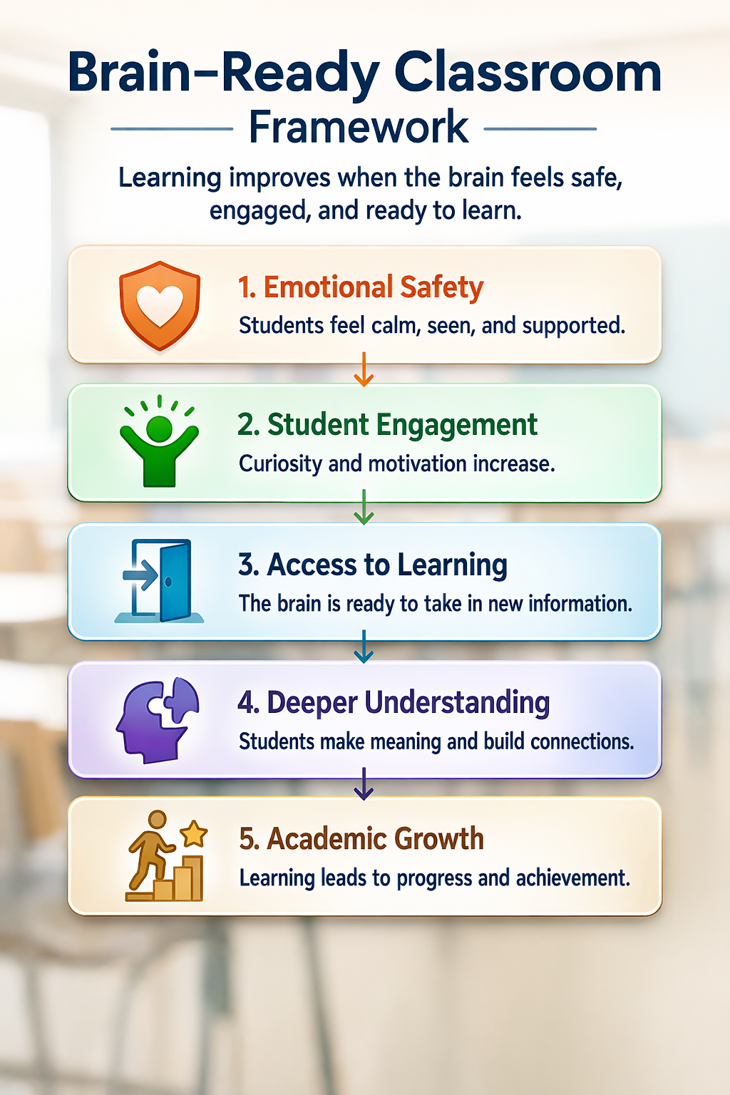 The Brain-Ready Classroom approach reflects a growing body of research emphasizing the importance of emotional safety, engagement, and cognitive readiness as foundations for effective learning.